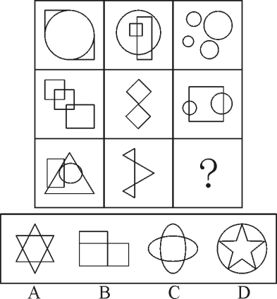 题干图形均由内外两部分构成,图1和图2的内部相同,图2和图3外部相同,依此规律,问号处应与图3内部相同、与图5外部相同,只有D项符合。
