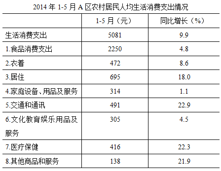 2014年1-5月A区农村居民人均消费性支出5081元,同比增长9.9%,增速较去年同期下降1.7个百分点。