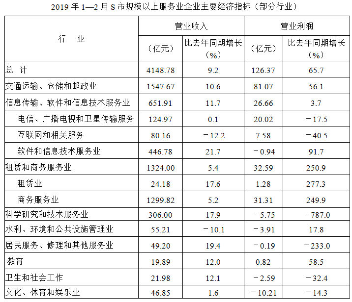 2019年1—2月S市规模以上服务业企业营业总收入4148.78亿元,同比增长9.2%,增速比上年同期低2.1个百分点;营业总成本4002.41亿元,同比增长7.5%;营业总利润126.37亿元,同比增长65.7%,增速比上年同期高8.7个百分点。