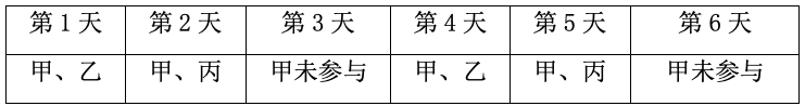 实际为甲乙,甲丙,乙丙的顺序轮流工作,故实际使用天数应介于最少和最多之间,即5天<实际工作天数<6天。