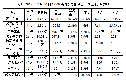 截止到2018年7月30日12:00,当天国内实时票房8369万元,而7月29日(周日)全天票房为41660万元;观影人次235.6万,放映场次约30万次,平均票价为35.5元。