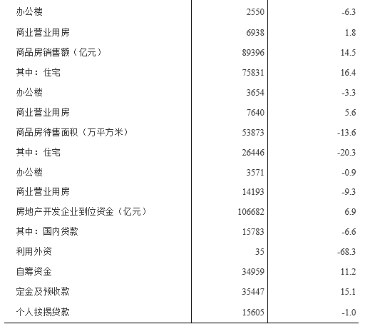 第二步,定位表格,商品房(销售面积77143万平方米,销售额66945亿元)、住宅(销售面积66852万平方米,销售额56604亿元)、办公楼(销售面积1949万平方米,销售额2837亿元)、商业营业用房(销售面积5257万平方米,销售额5772亿元)。