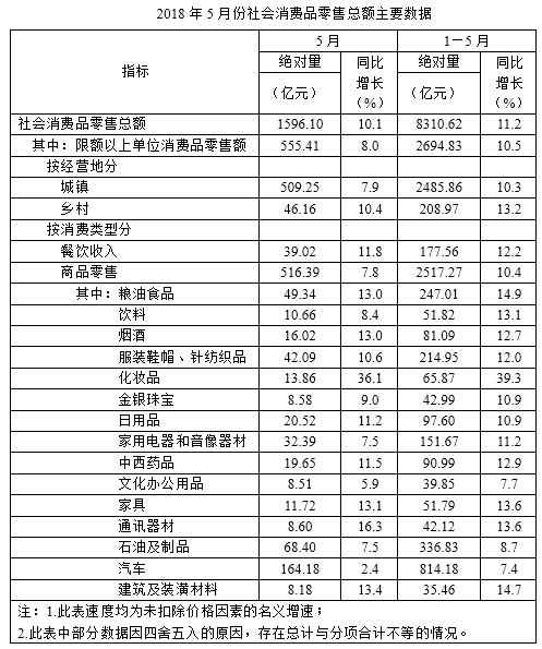 2018年1—5月份,某省社会消费品零售总额8310.62亿元,其中,限额以上单位消费品零售额2694.83亿元,增长10.5%,增速较上年同期加快了5.5个百分点。