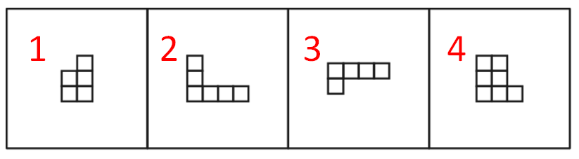 1、上边四个图形中,只有一个是由下边的四个图形拼合(只能通过上、下、左、右平移)而成的,请把它找出来。