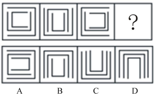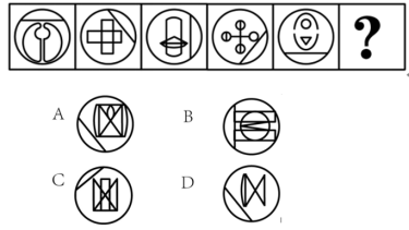 图形内部的直线每次顺时针旋转45°,排除B、C项;再观察发现图形内部的图形都是轴对称图形,对称轴依次是竖、横、竖、横、竖,问号处内部图形应为横轴对称的图形,排除A项。