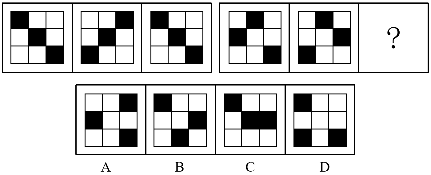组成元素相同,每个图形都是由九宫格外框、3个黑方块、6个白方块构成,但每一幅图中3个黑方块均发生明显位置变化,考虑平移。
