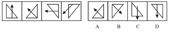 题干图形中,箭头依次逆时针旋转45度,依此规律,排除A、B项。继续观察,图1到图2、图2到图3、图3到图4,三角形依次左右翻转、向下翻转、左右翻转,即左右翻转、向下翻转交替出现,再向下翻转,只有C项符合。