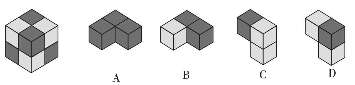 4、下列所给图形的左侧是一完整的立方体,中间和右侧再加上下列选项中的( )就可以构成左侧的完整的立方体。