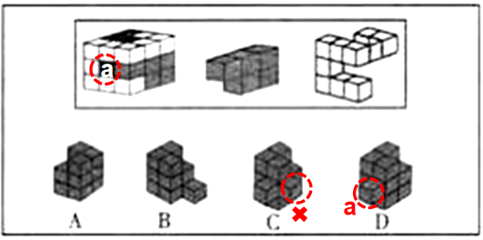 图2与图3拼合后,图1左面a处空缺,选项应在相应位置有凸起填补,排除A项、B项;图2与图3拼合后,图1右面无凹陷空缺处,无需凸起填补,排除C项。只有D项符合。