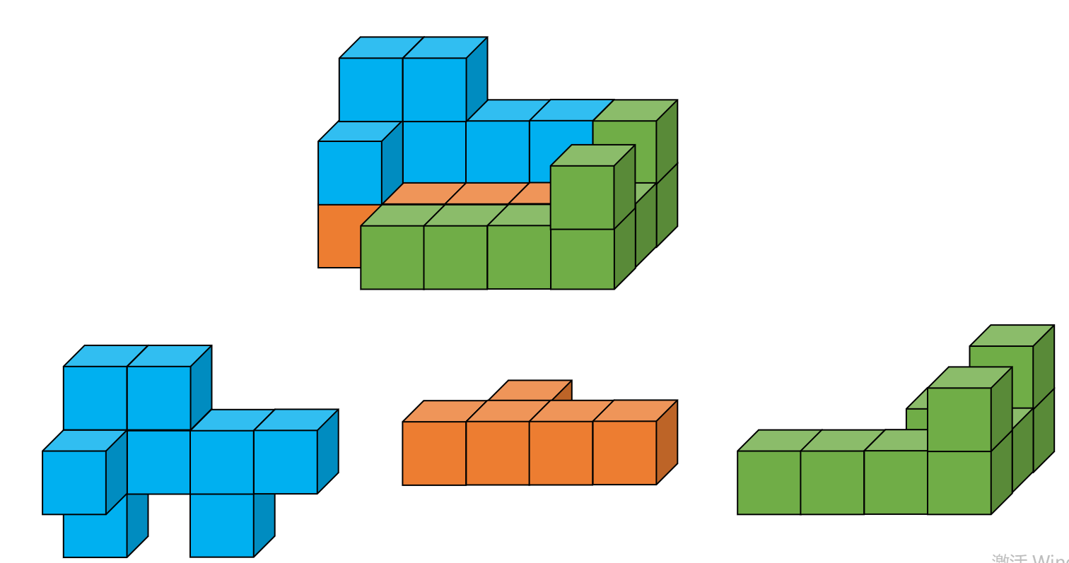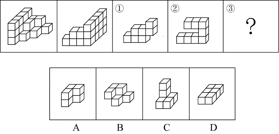 1、左图给定的是由相同正方体堆叠而成多面体的正视图和后视图。该多面体可以由①、②和③三个多面体组合而成,问以下哪一项能填入问号处?