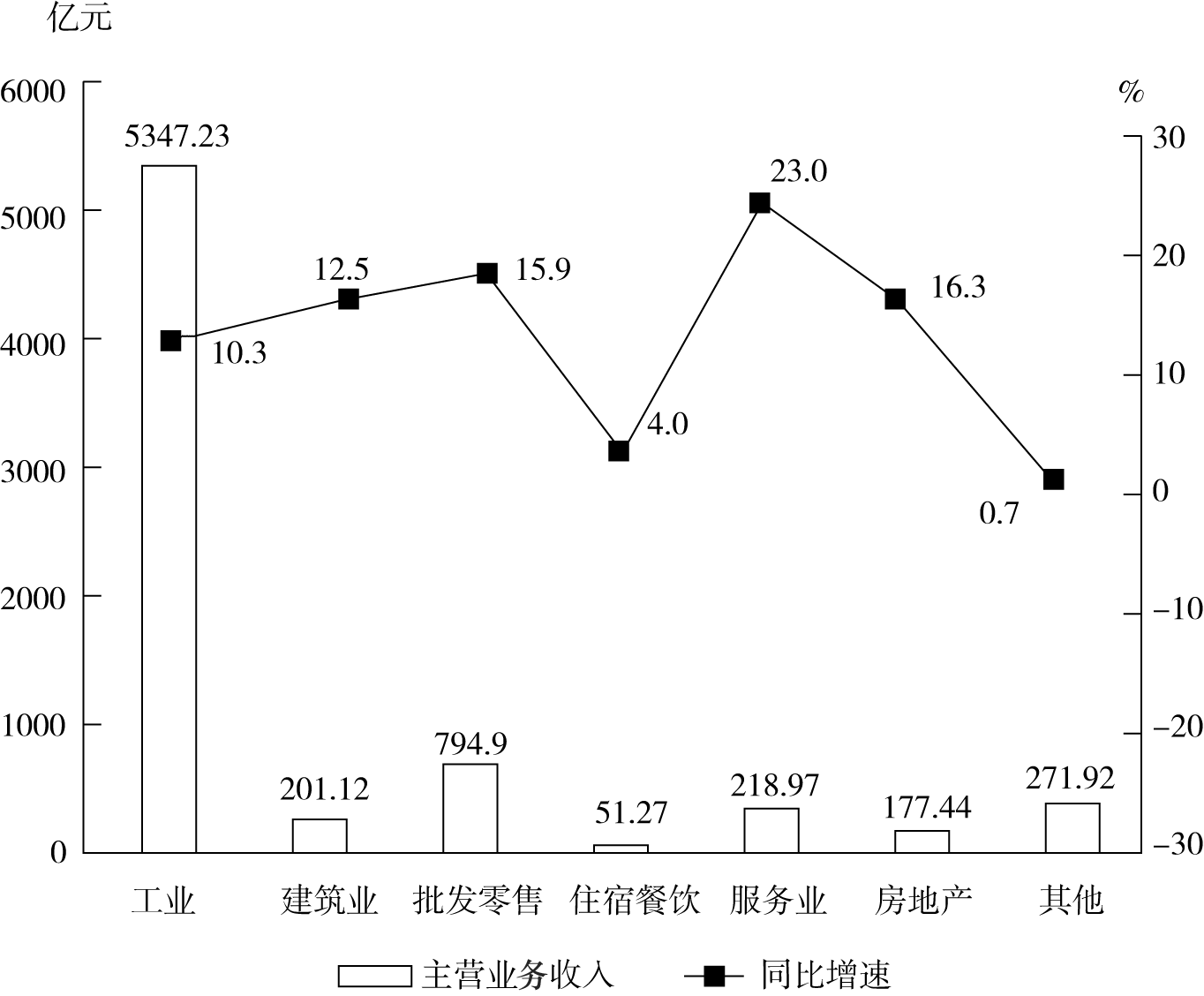 2015年一季度,某省省级及以上园区(以下简称园区)实现主营业务收入7062.85亿元,同比增长11%,实现主导产业主营业务收入4369.54亿元,同比增长10.4%。