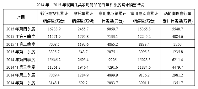 第三步,2015年销量超过2014年销量的有彩色电视机和家用电风扇,共两类。
