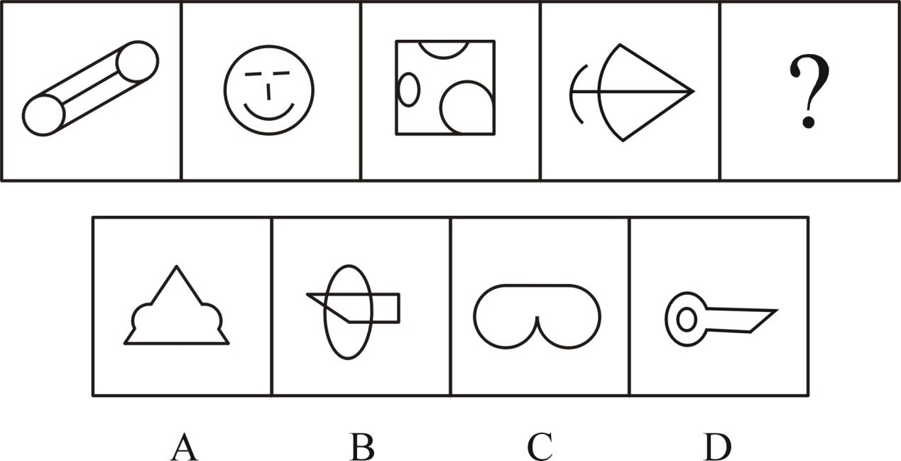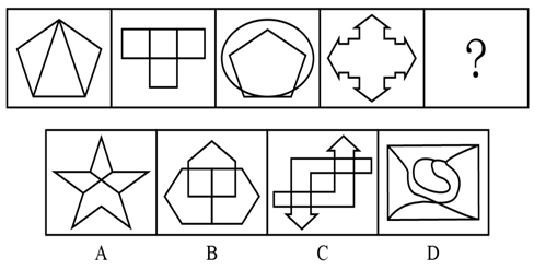 题干中所有图形均为竖轴对称,排除C、D项;第一个图形是典型的一笔画图形,考虑一笔画,题干图形均能一笔画成,问号处应该选择一笔画图形,只有B项符合。