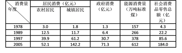第三步,减法计算,考虑截位舍相同,1978年,城镇居民消费和社会消费品零售总额相差4-2=2(亿元);1989年,二者之差为22-12=10(亿元);1997年,二者之差为86-61=25(亿元);2005年,二者之差为184-142=42(亿元),相差最大的是2005年。(或者直接观察数据,明显可看出2005年的差距最大)
