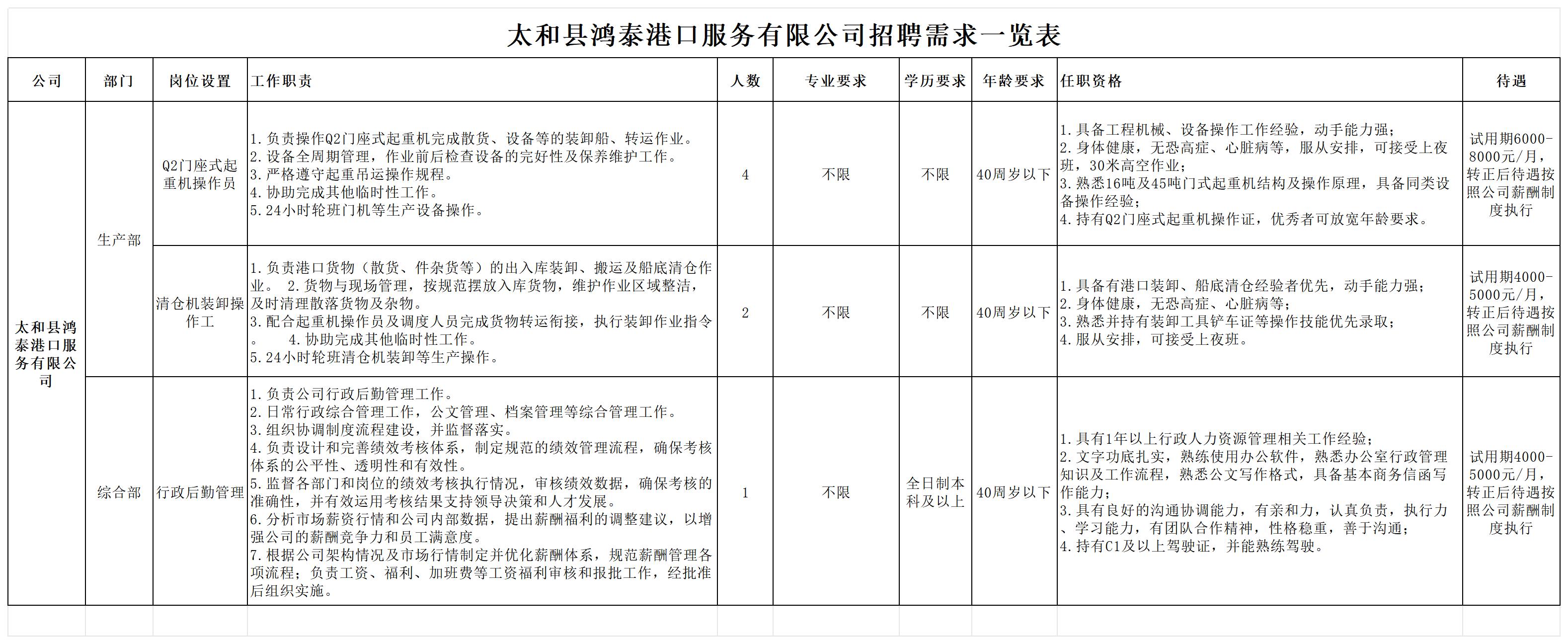 详见《太和县鸿泰港口服务有限公司招聘需求一览表》