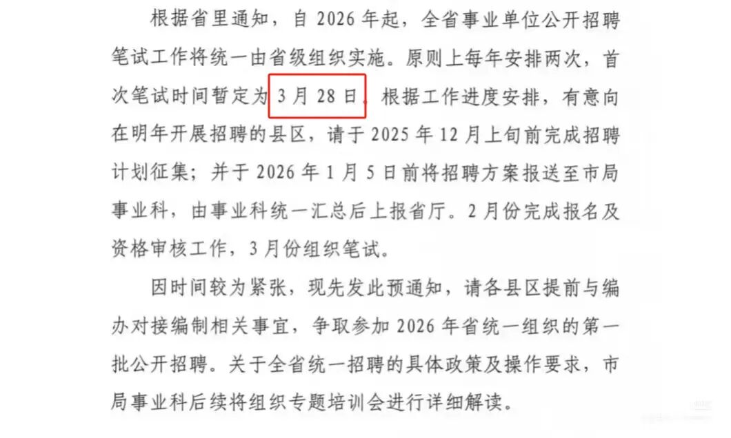 根据往年安徽事业单位联考的招录安排来看,安徽2026年事业单位联考笔试时间很有可能安排在3月29日!