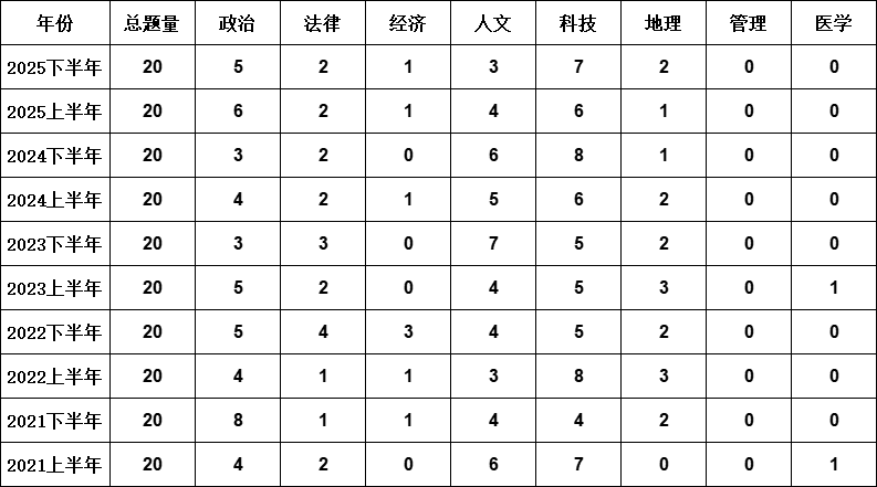 🔸常识判断考查的知识模块主要涉及政治、法律、经济、人文、科技、地理、管理等方面。题量较为稳定,每年考查20道题目,其中科技、人文、政治是三大重要考查模块。