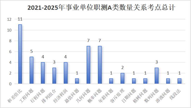 🔸从2021-2025年上半年事业单位A类试题的统计可以看出,和差倍比问题、工程问题、行程问题、排列组合与概率问题、经济利润问题、几何问题为重点考查题型。其中,和差倍比问题几乎每年必考,且每次考查题量1~2题,应重点关注;工程问题、行程问题、排列组合与概率问题、经济利润问题、几何问题在近几次考试中占比也较高,也应重点关注。