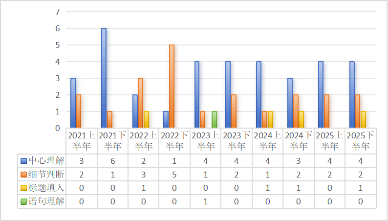🔸阅读理解的题量稳定在5-8道,中心理解题为必考题型,且中心理解题在阅读理解中的占比较大。在中心理解题中,“行为脉络”和“必要条件关系”是高频考点。