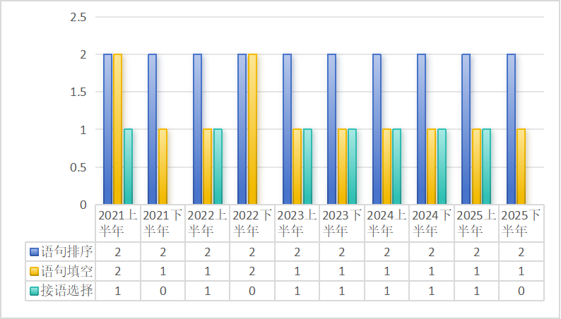 🔸在联考A类的考试当中,语句表达题量一般在3-5道,题量比较稳定。在三种题型中,语句排序题和语句填空题考查题量相对较大,近五年平均每年语句排序固定考查2题,语句填空每年固定考查1-2题。接语选择题概率性考查1题左右,建议大家掌握各种题型的基本解题方法,做好充足准备。